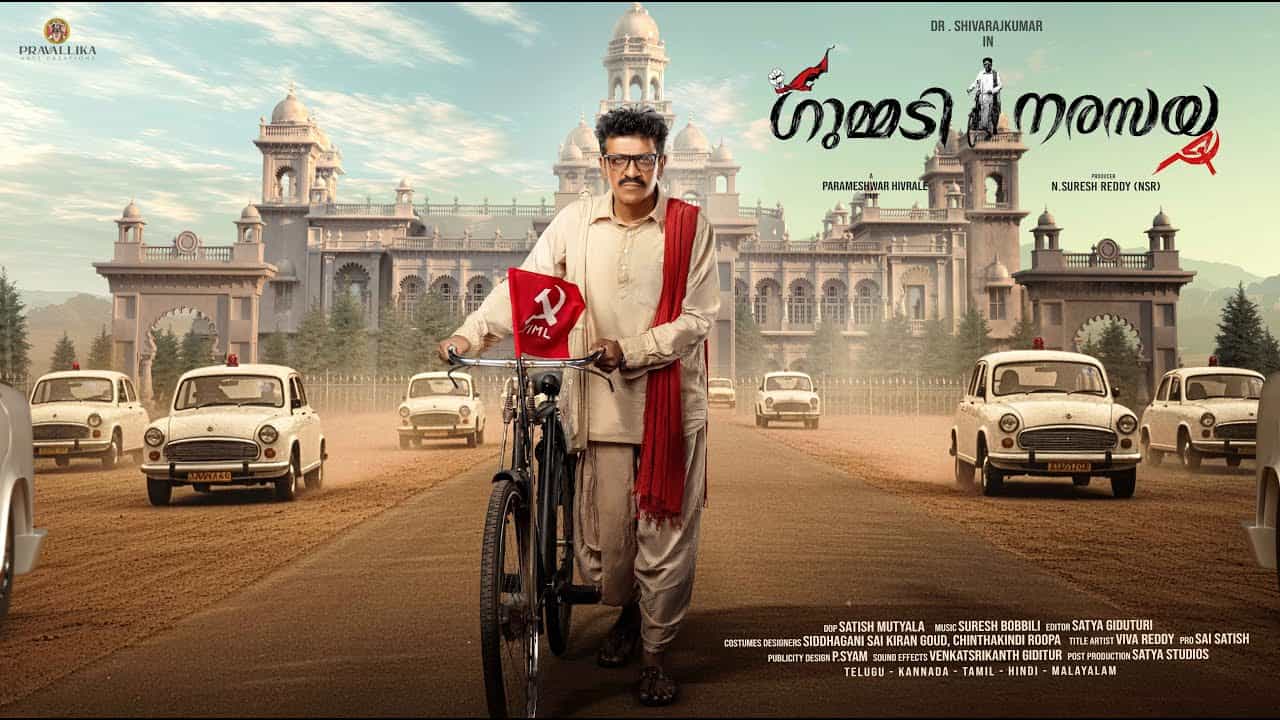 The first look shows Dr. Shivraj Kumar, wearing glasses, a simple white kurta and pyjama, and a red scarf draped over his shoulders, riding a bicycle on a wide road. The assembly is visible in the background. A red flag bearing the hammer and sickle, the symbol of Left ideology, hangs from the bicycle. This clearly indicates the political leanings of the character and the ideological focus of the narrative. Shivraj Kumar effortlessly embodies the spirit of Gummadi Narsaiah, displaying humility and quiet strength.