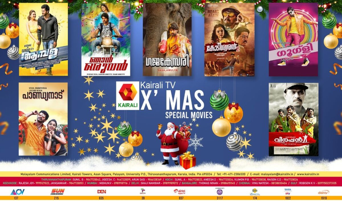 Gaja Kesari , Pandiya Naadu , Kodeeswaran, Aambbala, Googly, Njan Oruvan are the Films Scheduled in Kairali Christmas. Vishal, Bharathiraja and Lakshmi Menon starring Pandiya Naadu is Directed by Suseenthiran Showing at 08:30 P:M on Xmas Day. Directed by Sundar C, Vishal, Hansika, Prabhu Starrer Aambbala showing at 04:00 P:M on the Same Day.