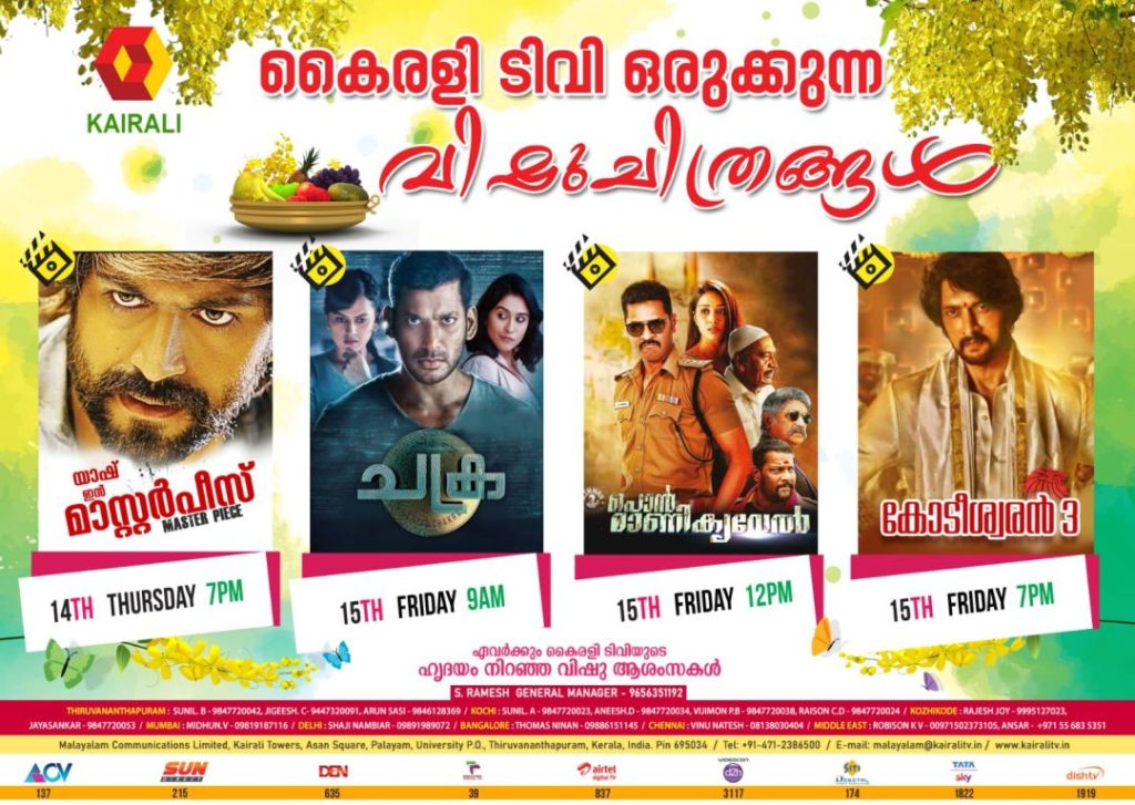 Kairali TV Announced Movie List for Vishu, Prabhu Deva Starer Tamil Movie Dubbed in Malayalam Pon Manickavel, Yash Movie Masterpiece and Sudeep Movie Kodeeswaran 3 etc listed. Vishal Starring ChakraRepeat Telecast Also Scheduled for Kairali Vishu.