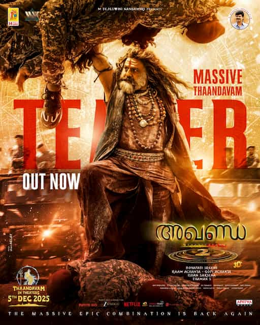 The teaser of “Akhanda 2: Thandavam“, directed by Boyapathy Srinu and starring Telugu superstar Nandamuri Balakrishna, is out. The film is set to release globally on December 5, 2025. “Akhanda 2: Thandavam”, the fourth film to feature the Boyapathy Srinu – Nandamuri Balakrishna team, is a sequel to their previous film ‘Akhanda’. The film, produced by Ram Achanta and Gopichand Achanta under the banner 14 Reels Plus, is presented by M Tejaswini Nandamuri.